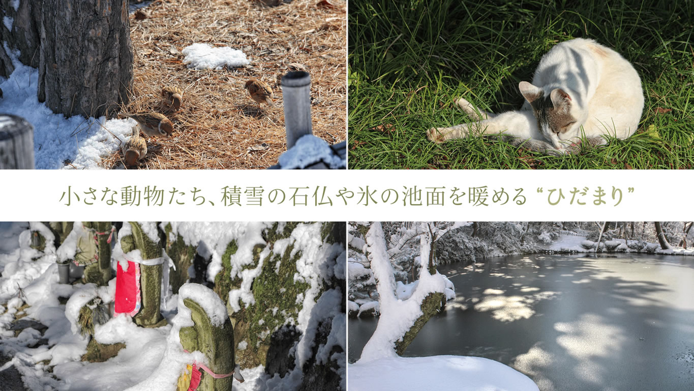 | 小さな動物たち、積雪の石仏や氷の池面を暖める“ひだまり” |