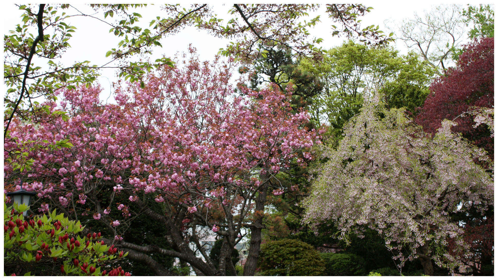 ところで北海道では五月に幾種類もの花が、いっせいに咲くと言われます。まさにその通りで、函館の庭園では緑の草地を背景に、サクラやツツジなどが咲き乱れ、春を謳歌していました。五月は最も、多彩な花が目立つ月と言えます。