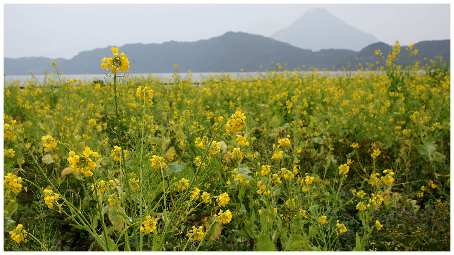 そして鹿児島の開聞岳の麓近くでは、早くも黄色いナノハナたちが、黄色い絨毯の畑を成していました。