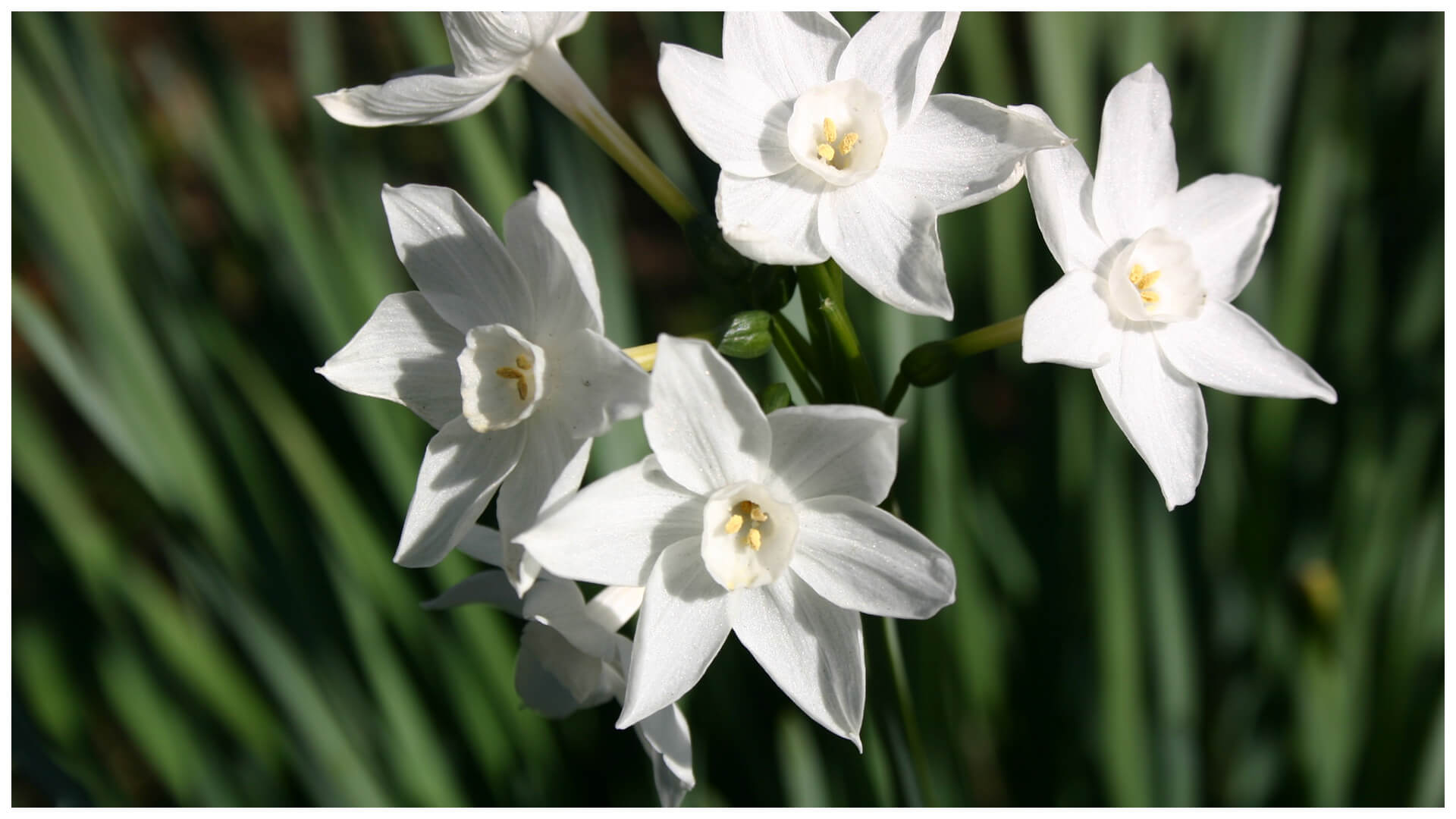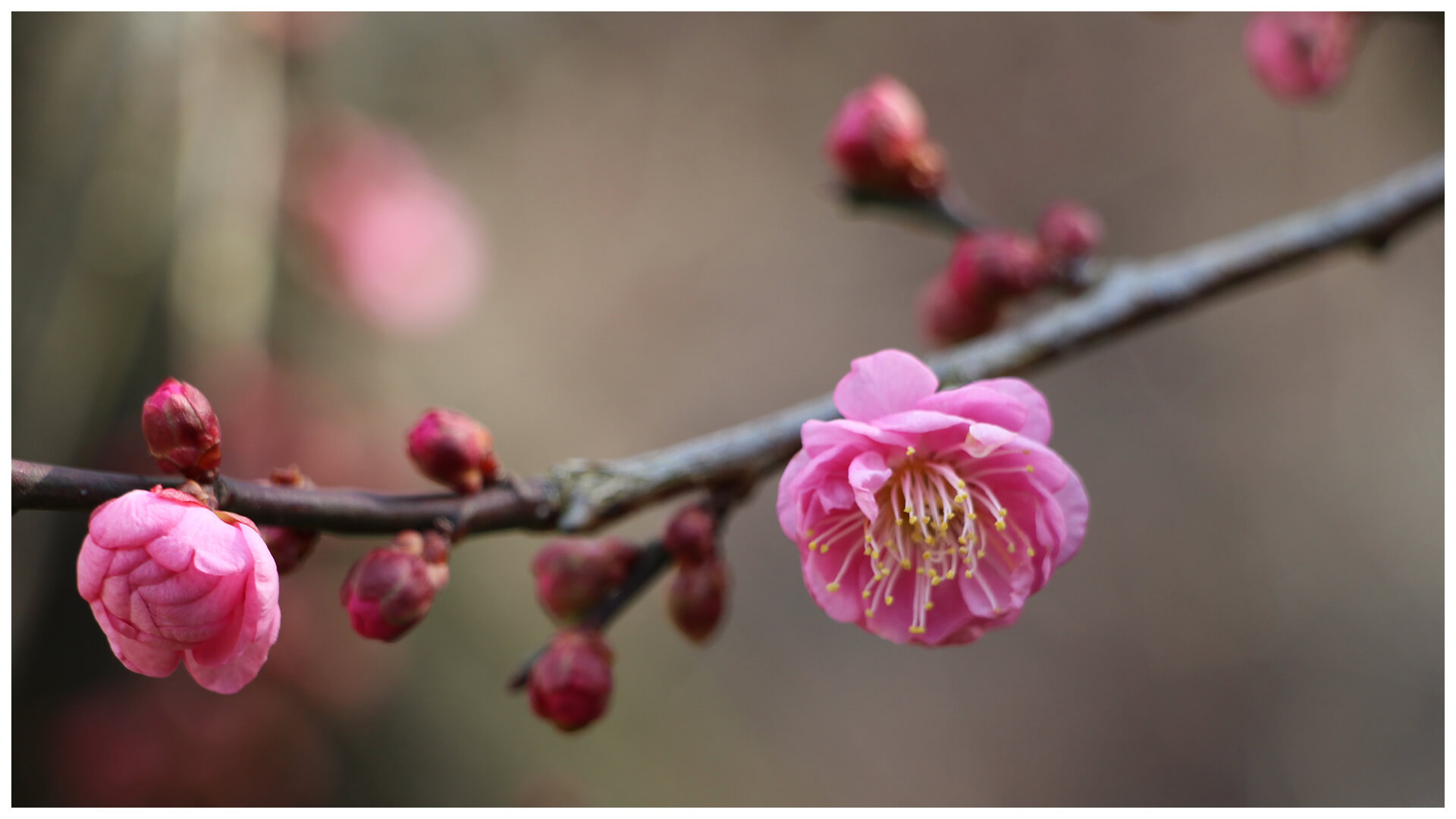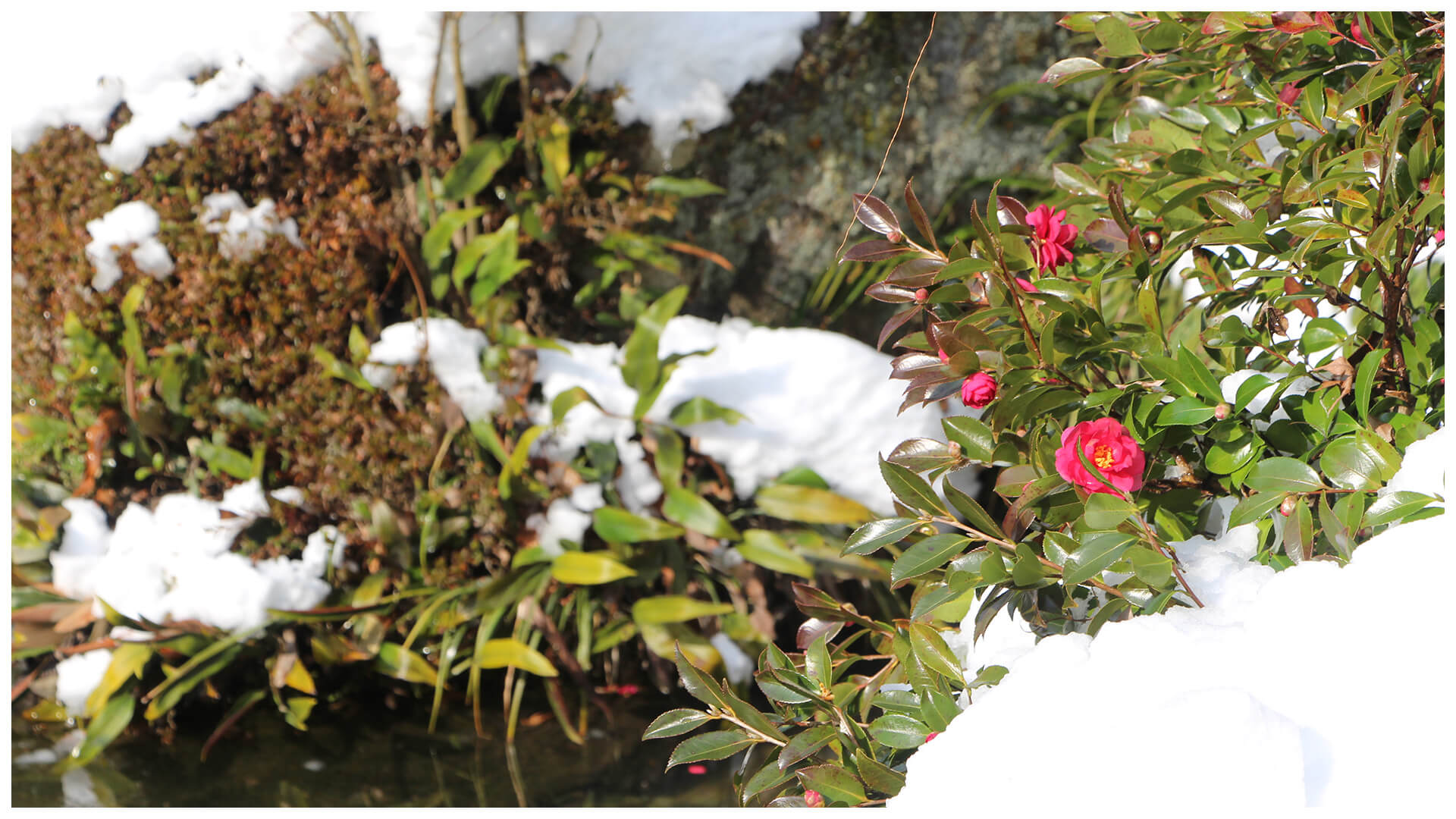 のような寒さの中で、冬を好む花たちが咲いています。福岡の庭では常緑のつる性植物であるクレマチス・ホワイトエンジェルが、釣鐘状の白い花を咲かせています。半開きで下向きに咲き、控えめで清楚な花。花弁の縁がそっくり返る可愛い姿をしています。東京の公園では白いスイセンの群落が、渡ってくる関東の空っ風を受けて断続的に揺れていました。また滋賀の百済寺では積雪の寺庭の隅で、陽を受けて雪解けに添うように、真っ赤なサザンカの花が存在感を示しています。一方、春の使者もやって来つつあります。岡山の後楽園にある梅林では、木枝に冬芽や蕾を連れて薄紅色の花弁が、開き始めていました。