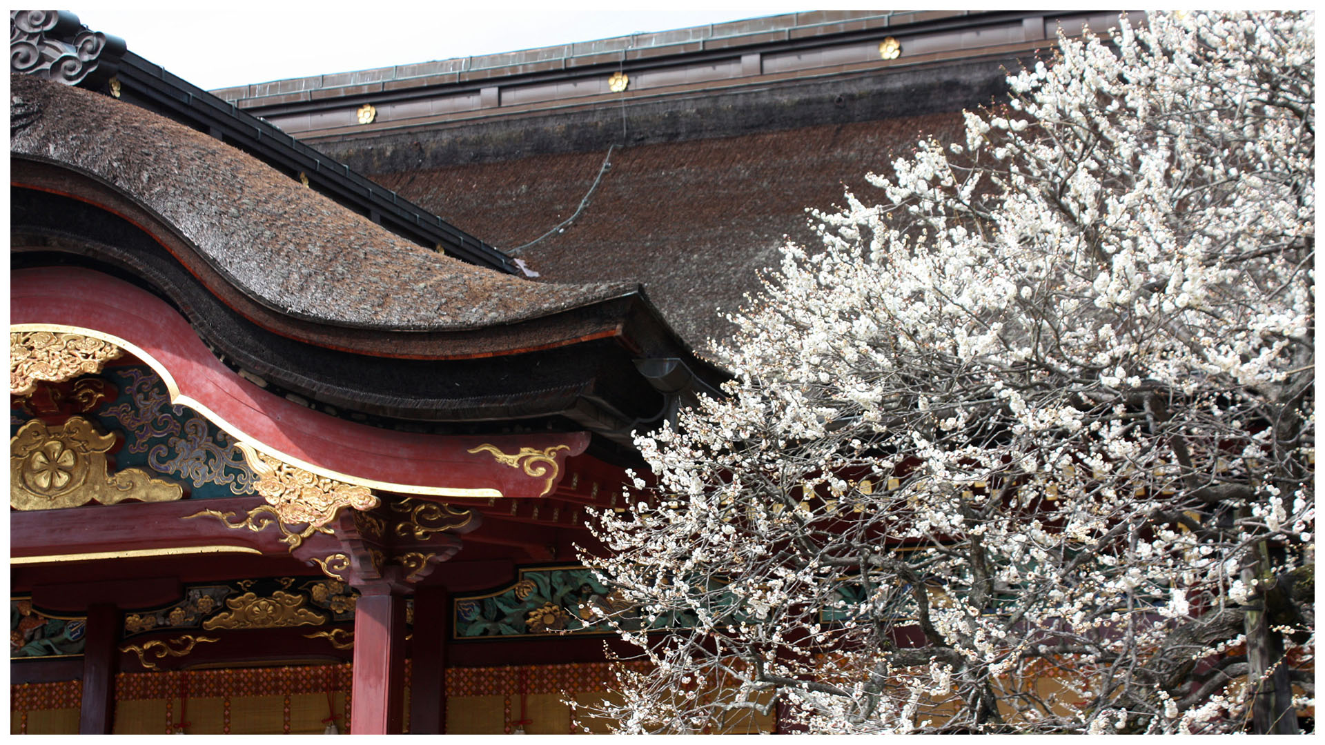 | 太宰府天満宮の本殿前の白梅(飛梅)